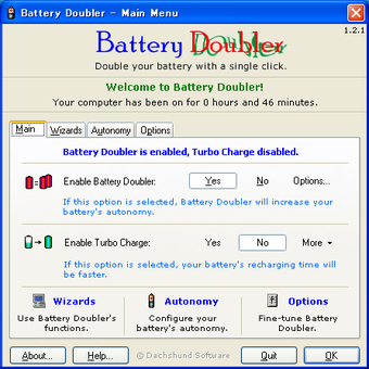 Battery DoublerはノートPCのバッテリー駆動時間を延長することが出来るツールです。CPUやハードディスク、画面のバックライト、DVDドライブ、無線LANなど電力を多く消費する機器をコントロールして、バッテリーの消費を出来るだけ抑えられるのが特長です。出張や外出先でノートPCを利用する人にとって便利なツールです。